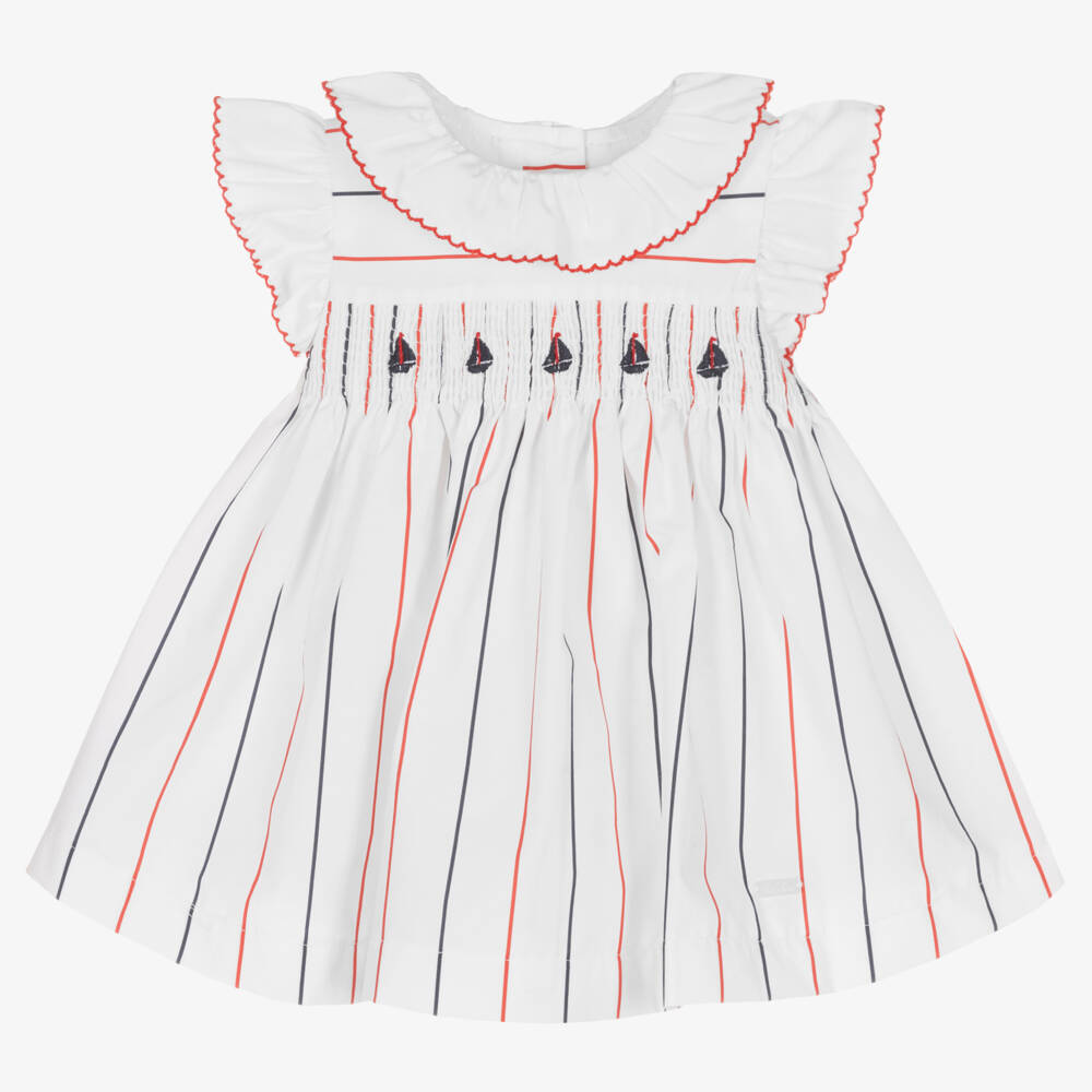 Baby girls white dress from Patachou, made in a lightweight poplin. Delightfully styled, this summery dress has red and navy blue stripes with a small logo charm just above the hem. There are ruffle trims and a shirred panel across the chest with embroidered blue sailboats. It is finished with a full lining and back button fastening.