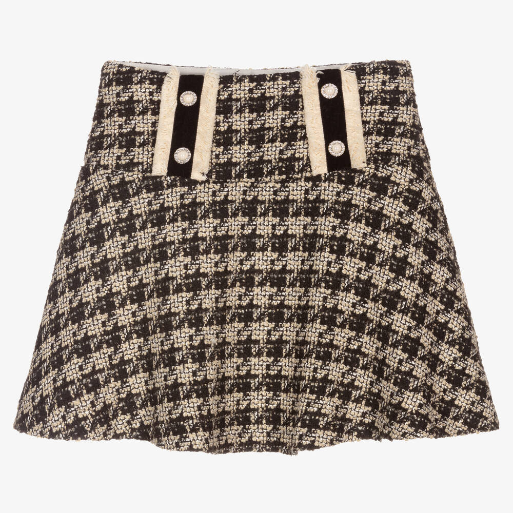 Classy black and ivory skirt for girls by Patachou, made in lightweight viscose tweed. Lined with lightweight voile, this zip fastening skirt has a houndstooth weave, with a slight sparkle. There are fringed trims on the front with decorative pearl buttons.