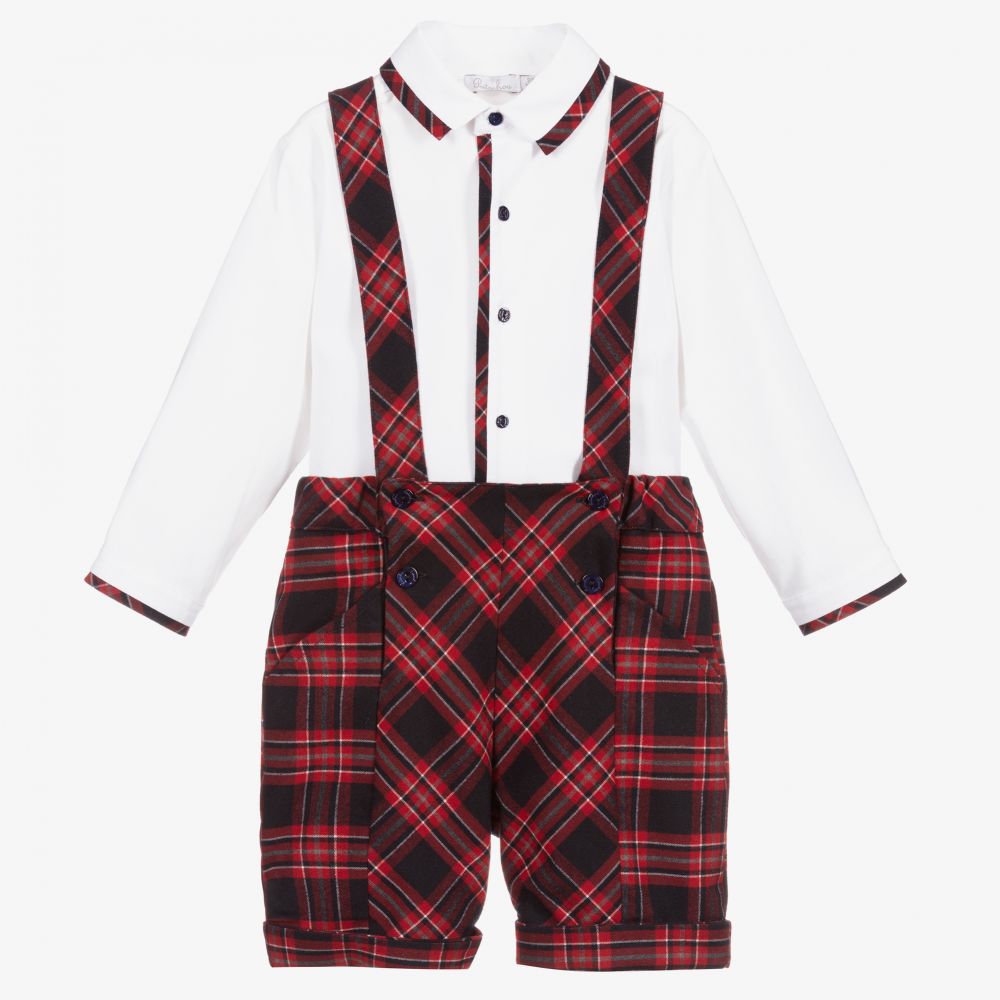 Shorts and shirt set for boys by Patachou. The white Oxford cotton shirt has navy blue and red tartan trims. The lined navy blue and red tartan shorts are made in a blend of polyester and viscose with a soft brushed feel. They have front pockets, front button fastenings, with an elasticated waist and adjustable, removable shoulder straps.