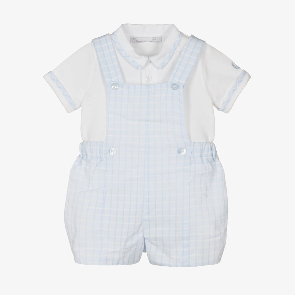 Little boys white and blue dungaree shorts set by Patachou, made in super-soft cotton. With a classic front button-fastening placket, the stretchy piqué polo shirt features a smart collar and cuffs edged with pale blue check fabric. The designer's subtle branding is embroidered on one sleeve in blue. Soft and lightweight, the sweet dungarees are patterned with tonal blue check and lined with cotton voile for comfort. The shoulder straps are adjustable for a great fit and the side panels are elasticated to assist with dressing.