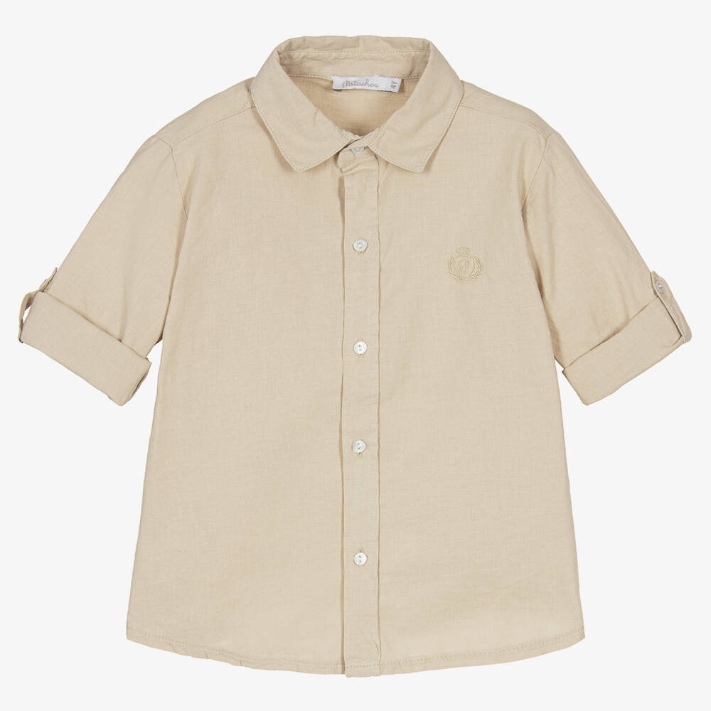 Boys classic beige shirt from Patachou. Soft, breathable and lightweight, it is woven in cotton and linen for comfort in warm weather. This smart shirt has buttons on the long sleeves, allowing the cuffs to be rolled up to keep cool. Subtle tone-on-tone branding is embroidered on the chest.