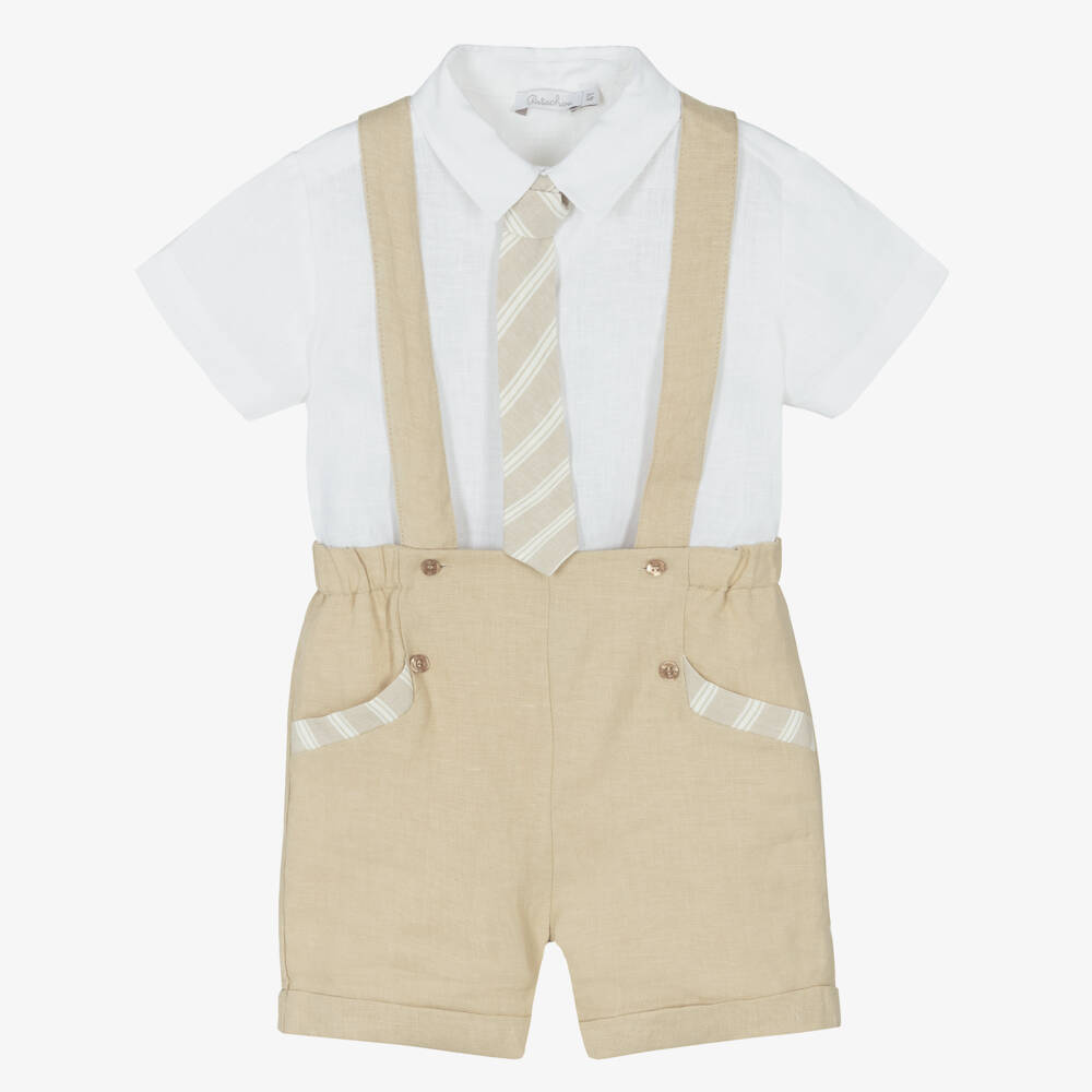 Lovely for a special occasion, this sweet white and beige shorts set for boys is from Patachou. Traditionally styled, the off white linen short-sleeved shirt has front button fastenings and a pointed collar. Attaching with buttons under the collar, there is a removable stripy tie, fixed in the classic shape for a hassle-free smart look. The pale blue shorts have matching striped trims, adjustable shoulder straps and a part elasticated waist for a good fit. They are lined with soft cotton voile for added comfort.