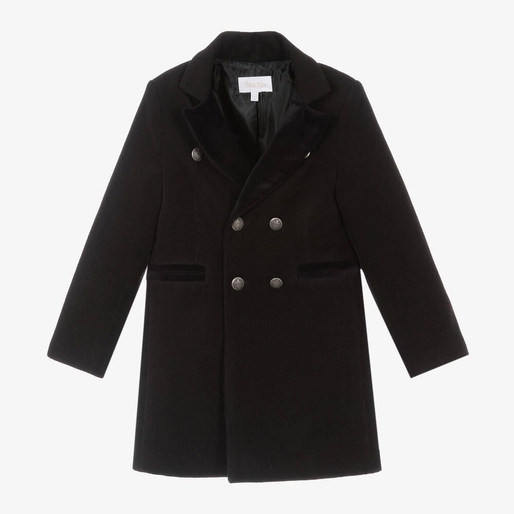 Black coat for boys by Patachou, made in soft, brushed, medium-weight fabric. Smart and traditional, it is trimmed with cotton velvet on the notched lapels and designed with heritage-look crest buttons in a double-breasted style on the front. Lined with silky fabric for ease of dressing, it has a vent on the back for freer movement and convenient pockets on the front.