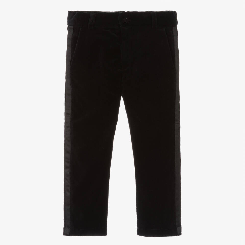 Smart black trousers for boys by Portuguese brand Patachou. They are made in luxurious velvet, with satin trims for an elegant finish. They fasten with a button and zip, and have an adjustable waist for an ideal fit. There are two front pockets, with an additional pocket on the back.