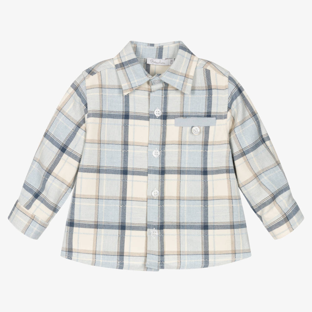 Checked shirt for boys by Portuguese brand Patachou, in shades of blue, ivory and beige. Made in soft cotton flannel, it fastens with branded buttons on the front and cuffs. For a stylish finish, the chest pocket has a pale blue corduroy trim and decorative button detail.
