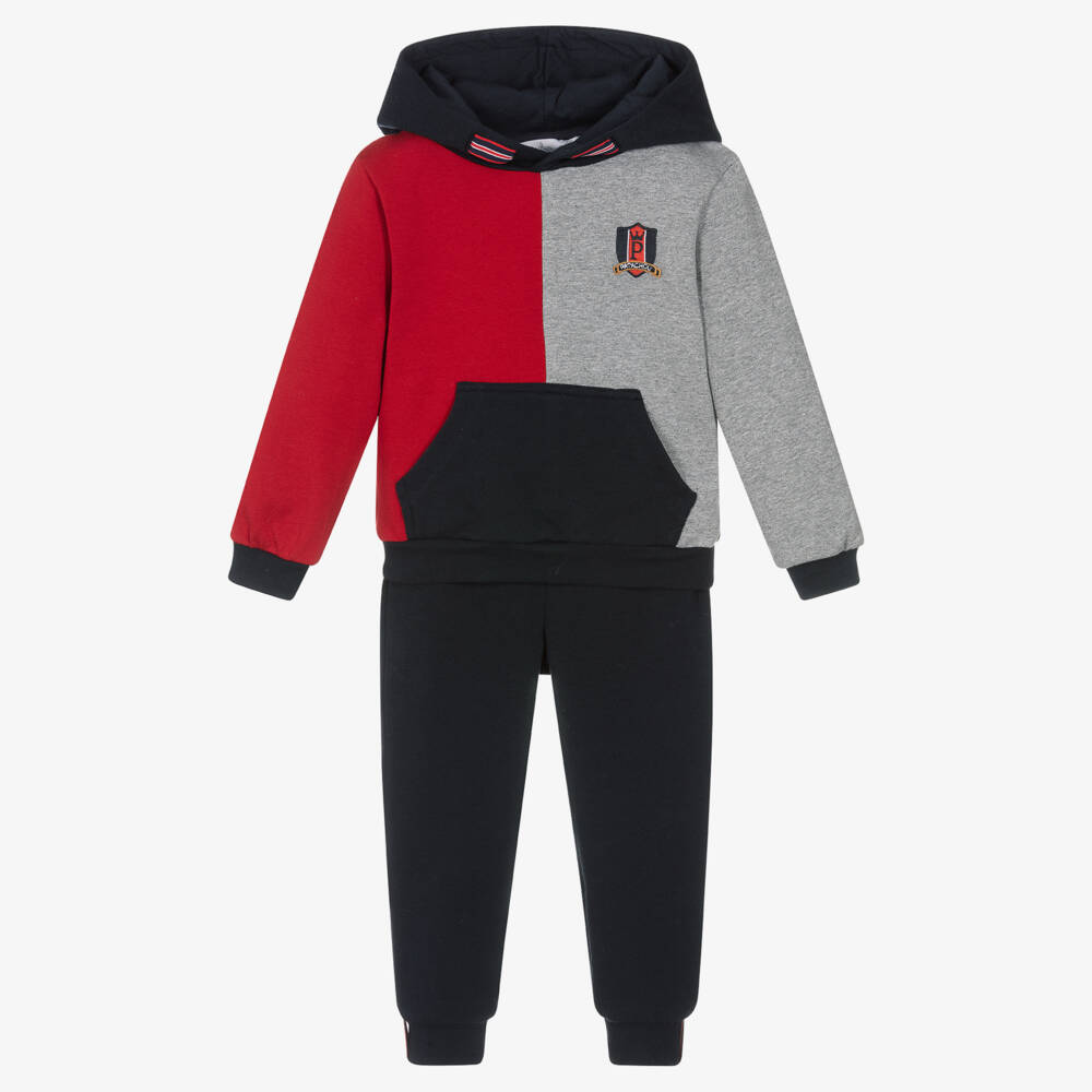 Navy blue colourblock tracksuit for boys by Patachou, made in comfortable cotton jersey with a cosy fleece feel inside. The hooded sweatshirt top has red and grey panels and a front pouch pocket. For a stylish touch, there is an embroidered crest logo design on the chest and matching ribbon trim on the hood. The cuffed joggers have a gently elasticated waist with a faux grey drawstring tie detail.