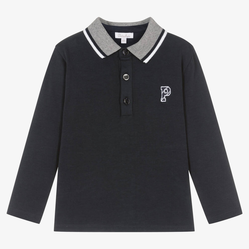 Smart-casual navy blue long sleeve polo shirt for boys by Patachou, made in soft cotton jersey. It has a grey ribbed collar, trimmed with a navy blue and white stripe. There are branded button fastenings and an embroidered logo on the chest for a subtle designer finish.