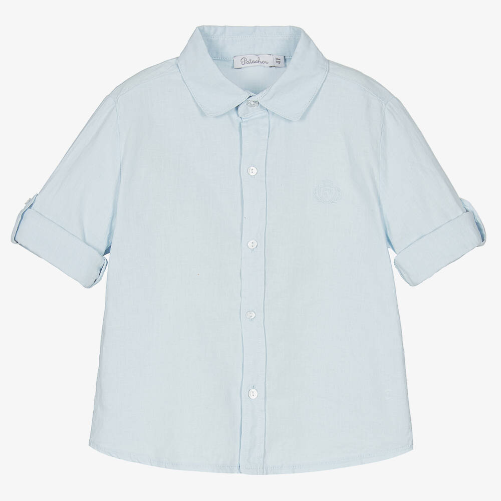 Boys classic pale blue shirt from Patachou. Soft, breathable and lightweight, it is woven in cotton and linen for comfort in warm weather. This smart shirt has button tabs on the long sleeves, allowing the cuffs to be rolled up to keep cool. Subtle tone-on-tone branding is embroidered on the chest.
