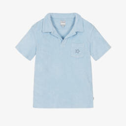 A blue polo shirt for boys by Patachou, made in soft and stretchy cotton piqué. Fastening with buttons on the front, it features white striped trims, a chest pocket and a slightly longer back hem.
