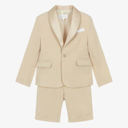 Exclusive to Childrensalon, this smart blue shorts suit for boys by Patachou is beautifully designed in luxurious crêpe fabric, ideal for weddings and special occasions. The satin-lined blazer features an elegant satin shawl collar, coordinating pocket trims, and a stylish faux pocket square. It is paired with tailored shorts that have a comfortable cotton lining and a useful adjustable waistband. Fastening with a zip and branded button, they have slanted pockets and turned-up cuffs.