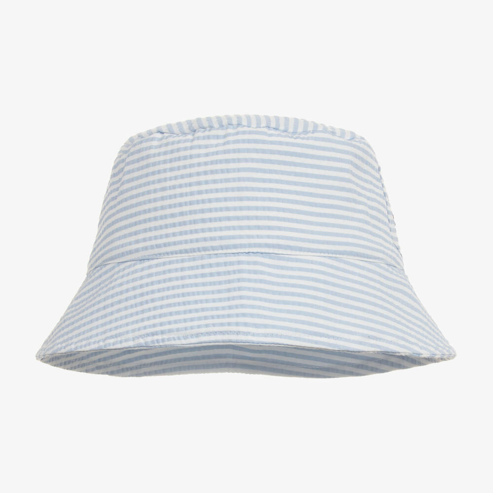 A blue and white hat for younger boys by Portuguese label Patachou, made in lightweight seersucker with a soft cotton lining. Patterned with stripes, it has a little patch pocket with sweet navy blue anchor embroidery for a nautical look.