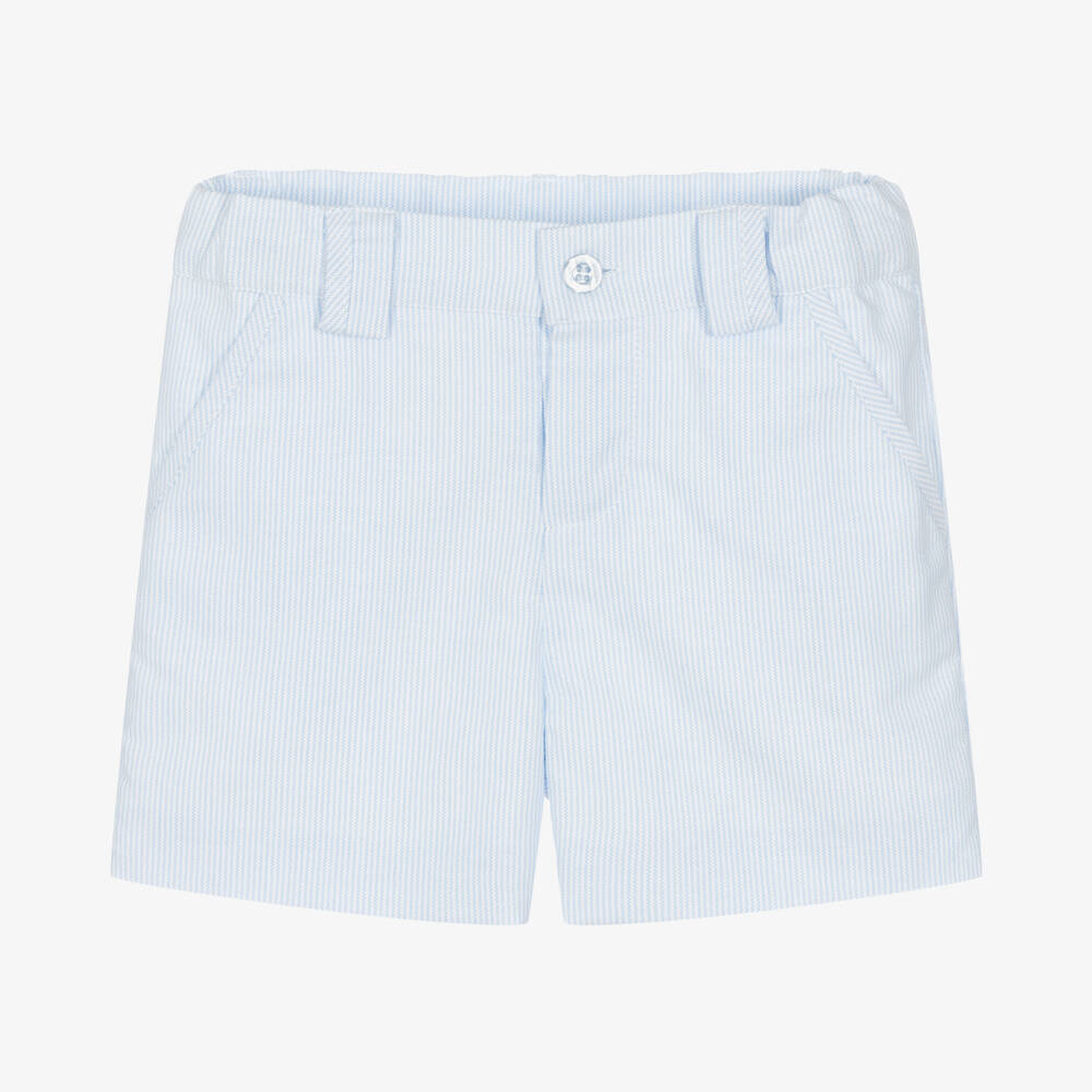 Smart pale blue and white pinstripe shorts for boys by Patachou, made in soft and lightweight cotton. Fully lined for comfort, they have slanted front pockets and a faux back pocket with a button trim. They fasten with a button on the front and have a useful adjustable waist to ensure a good fit.