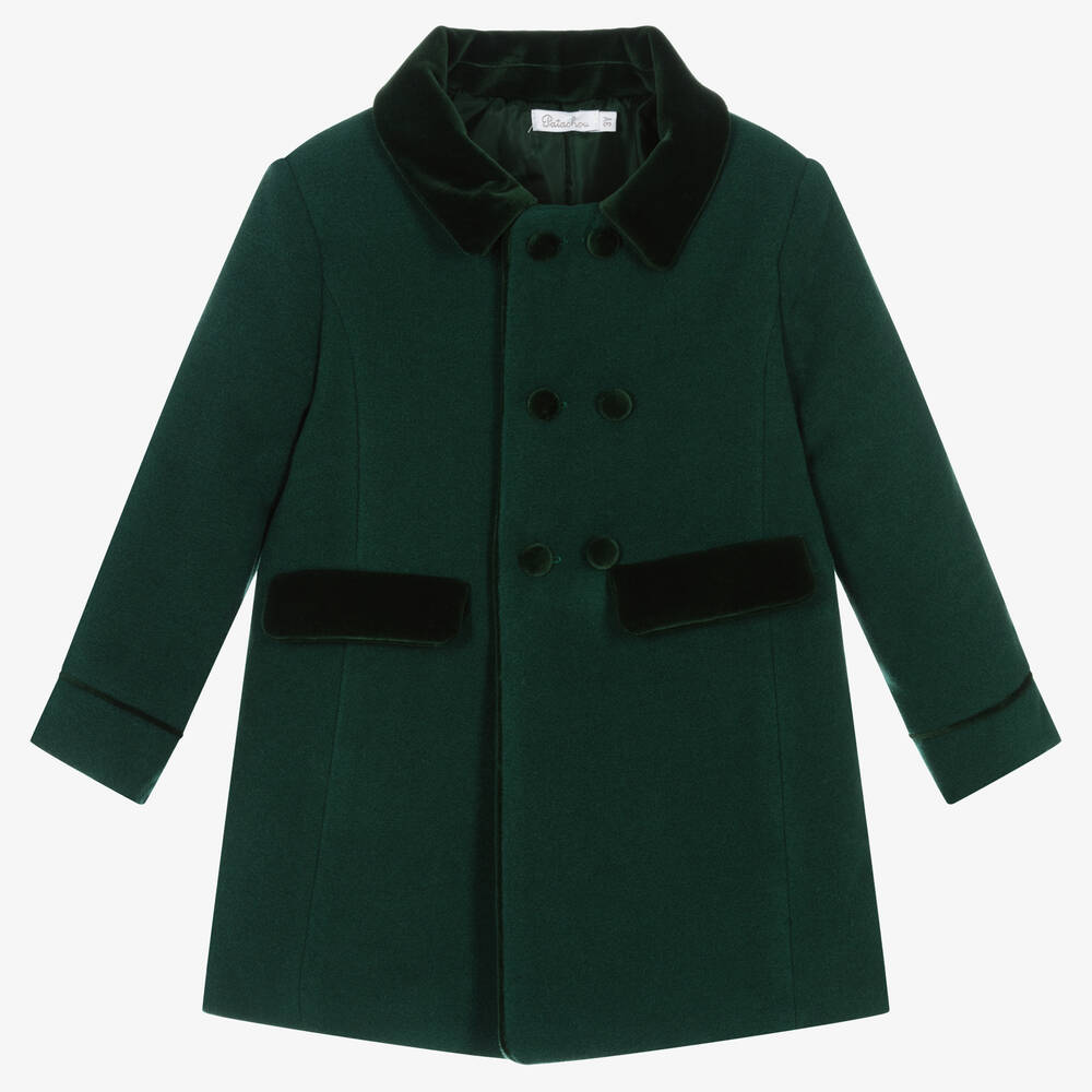 A green felted coat for boys by Patachou, with a silky smooth lining. Classically styled, it has a velvet collar, double-breasted button fastenings and flap-over pockets. It is gently padded for warmth and has a single vent at the back to allow for movement.