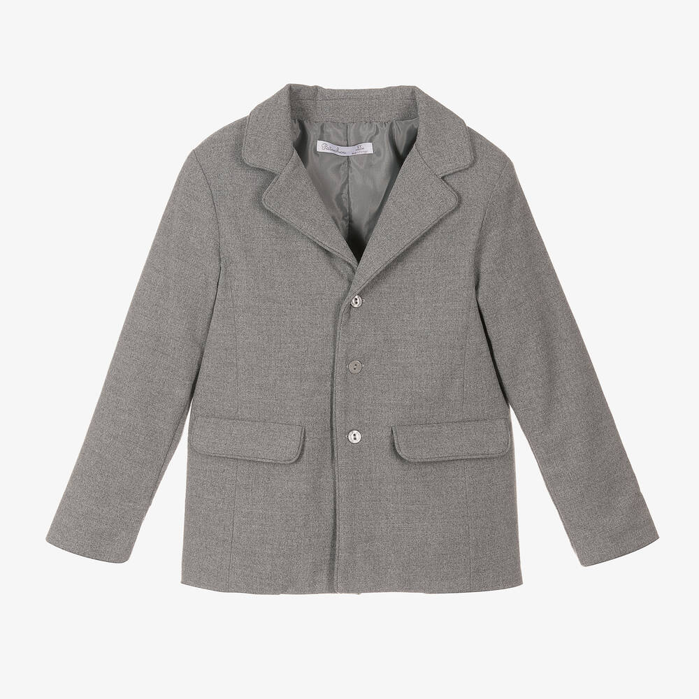 Smart pale grey blazer for boys by classic Portuguese brand Patachou, made in super soft flannel. Ideal for a smart occasion, it fastens with logo buttons, has piped trims and useful front flap pockets. It is lined in satin for comfort.