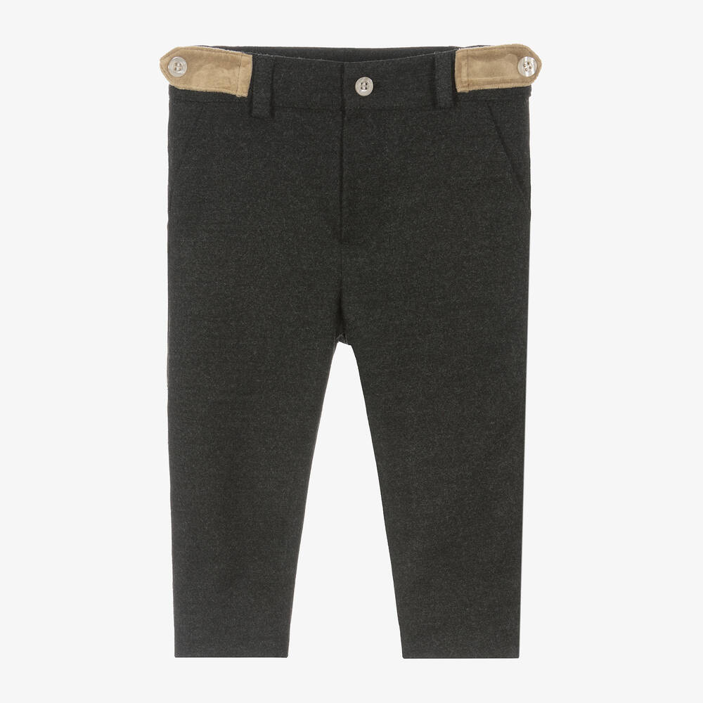 Super smart, these dark grey suit trousers for boys are by Patachou. Made from soft brushed twill with a lightweight lining, they have velvety beige button tab trims on the adjustable waistband and a matching welt pocket on the back. They fasten with a pearlescent branded button on the front for a neat finish.