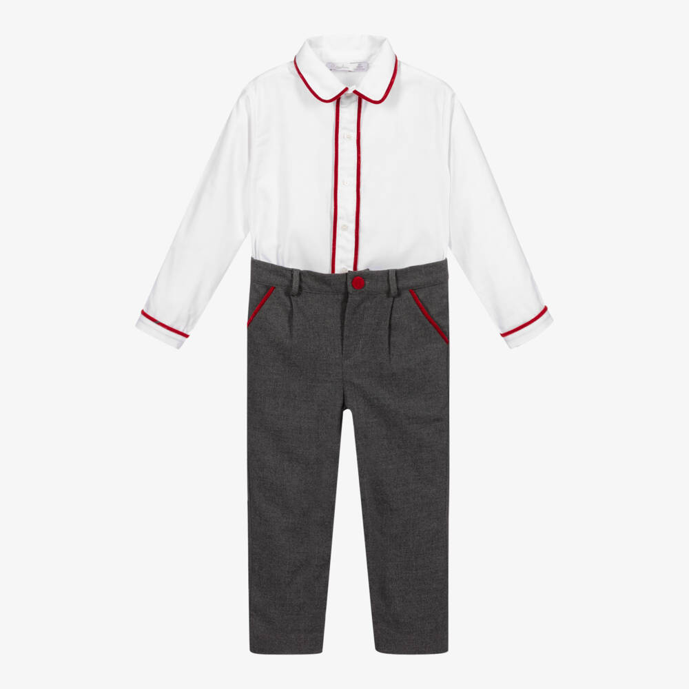 Grey and white trouser set for boys by Patachou, with smart red velvet trims. The white top part is made in soft cotton poplin with front button fastening. The grey trousers are made with soft, brushed flannel with two front pockets, fastening with a zip and velvet covered button. They have an adjustable waistband and are lined with lightweight cotton for comfort.