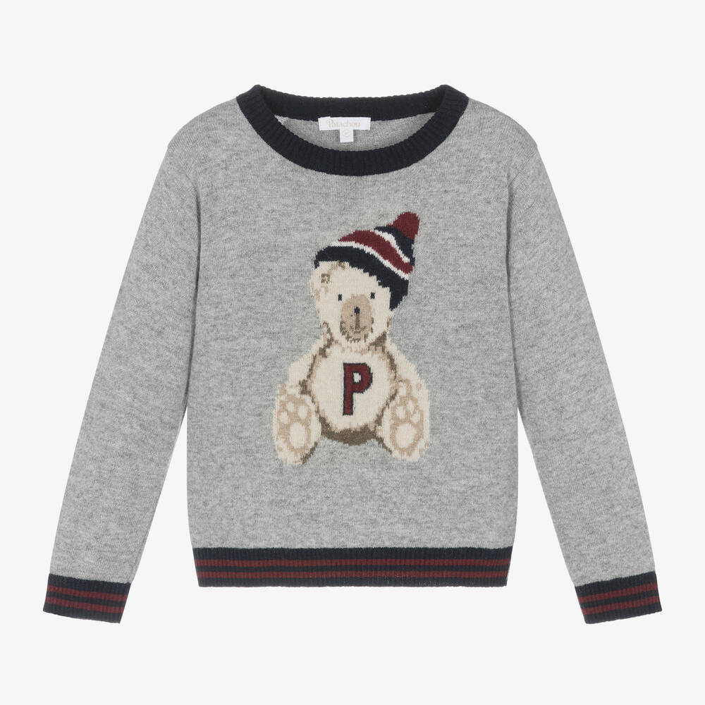 Grey sweater for boys by Patachou, knitted in a blend of luxuriously soft viscose and extra fine Merino wool, with a hint of cashmere. There is an adorable teddy bear logo motif on the front, wearing a winter hat with navy blue and burgundy red stripes to match the sweater's ribbed cuffs and hem. Smaller sizes have buttons on one shoulder to help with dressing.
