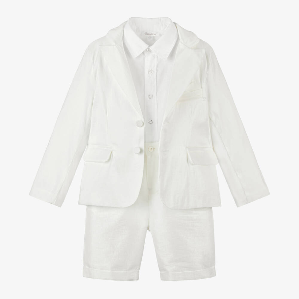 An ivory suit for boys by luxury brand Patachou, designed in a silky textured fabric. In a single-breasted style, the smart blazer has pointed lapels, a decorative chest pocket and neat flap pockets. It fastens with fabric-covered buttons and has open seams on the back. Fastening with a button and zip, the coordinating shorts have a three-pocket design with fixed fold-up hems, adjusting at the waist for a tailored fit. A lightweight linen and cotton blend shirt completes the outfit, embroidered with a heritage logo emblem.