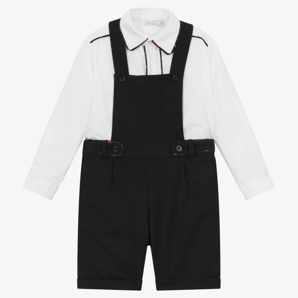 Traditionally styled navy blue shorts set for younger boys by Patachou. The white cotton twill shirt fastens with branded buttons on the front and cuffs and has a smart tartan trim. It pairs beautifully with the tartan-trimmed dungaree-styled shorts. Made in a beautifully soft, brushed fabric, they have a traditional bib front, button fastening adjustable straps, and smart turn-up cuffs. The back is elasticated for comfort and there are decorative buttons on the waist.