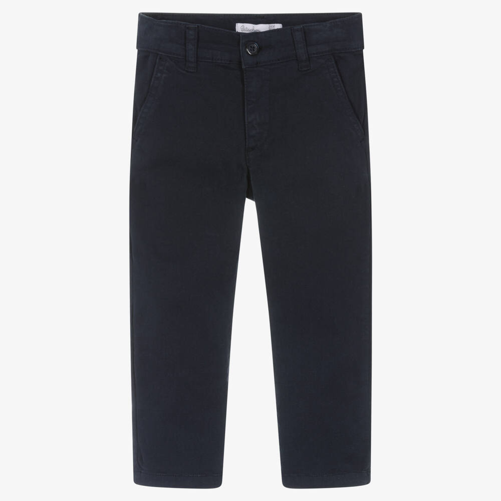 Navy blue chino trousers for boys by Portuguese brand, Patachou, made in comfortable cotton twill with a soft brushed feel. A classic and versatile style, they fasten with a zip and button and have an adjustable waist for a great fit. There are slanted pockets on the front and a single welt pocket on the back with a tonal embroidered logo above.