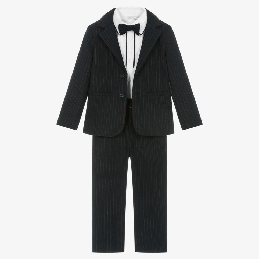 Smart navy blue pin stripe suit set for boys by Patachou. Made in a beautifully soft, brushed fabric, the classically styled jacket has pockets on the front, a silky lining and branded button fastenings. The matching trousers have pockets on both the front and back, piped trims, and an adjustable waistband, with button and zip fastening. It comes with a white cotton twill shirt, with smart pin-tucks on the chest, navy blue trims and buttons fastenings. A matching navy blue bow tie that secures to the shirt with buttons, completes the set.