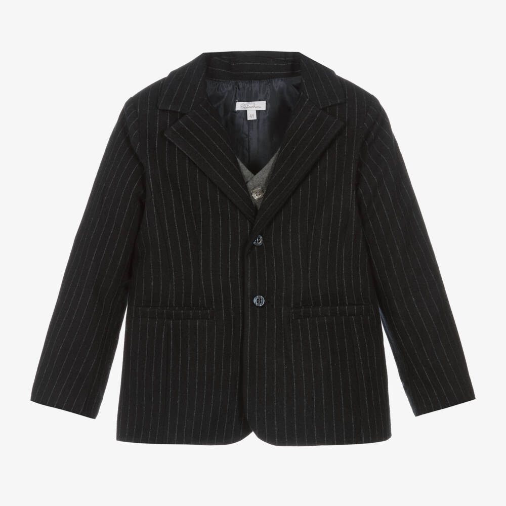 Smart navy blue pinstripe blazer for boys by Patachou, made in soft fine flannel. Fully lined, it has notched lapels, welt pockets, and a grey faux waistcoat insert beneath the front button fastening. Classically styled, this blazer is great for formal occasions.