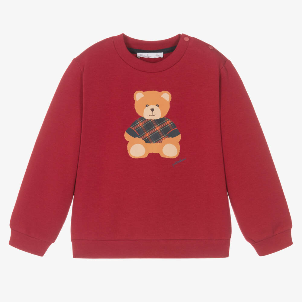 Cute red sweatshirt for boys by Patachou, made in soft cotton cotton jersey, with a fleecy inside. It has a lovely brown bear print on the front, with a navy blue and red tartan jumper detail. There are useful popper fastenings on one shoulder.