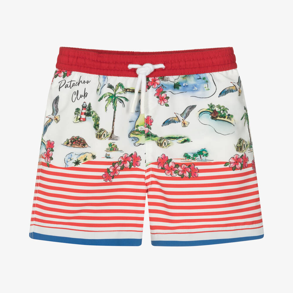 Boys red and white striped UV50 swim shorts, by Patachou. Lined in soft mesh, they are printed with a tropical island print for a fun look and have a stretchy, drawstring waist for poolside comfort.