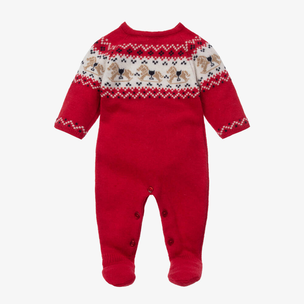 Adorable red knitted babygrow for boys from Portuguese brand Patachou, in a luxurious viscose, Merino wool and cashmere blend. Super soft and cosy, it is patterned with a cute rocking horse design in white, beige and navy blue. For a designer touch, the babysuit fastens with branded buttons on the back and between the legs.