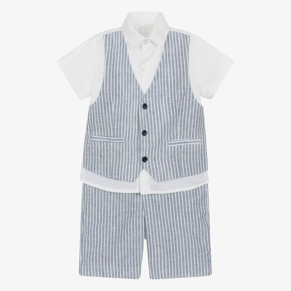 Lovely for a special occasion, this white and blue striped shorts set for boys is from Patachou. The white linen shirt has an attached waistcoat front, with button fastenings and faux pockets. The matching linen and cotton blend shorts are lined for comfort and have slanted front pockets and a single back pocket. They fasten with a zip and button and have an adjustable waist for a good fit.