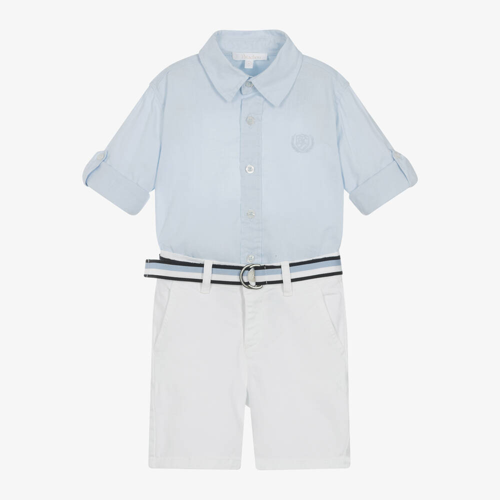 Smart-casual cotton shorts set for boys by luxury Portuguese brand Patachou. The pale blue, cotton and linen-blend shirt has an embroidered, varsity-style logo on the chest, with buttons and tabs on the sleeves so they can be rolled up and secured. It fastens with logo buttons on the front. In a classic chino style, the shorts are made in soft twill, with slanted front pockets and a welted back pocket. The back pocket has a varsity-style, embroidered logo and the waistband is adjustable for a great fit. The shorts fasten with a button and zip, and come with a detachable, webbed belt, striped in shades of blue and white.