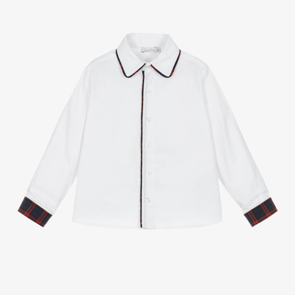 Exclusive to Childrensalon, this white cotton shirt for boys is by Portugese brand Patachou. This smart style has a collared neck and branded button fastenings on the front and cuffs. Contrast navy blue and red tartan check trims add a traditional finish.