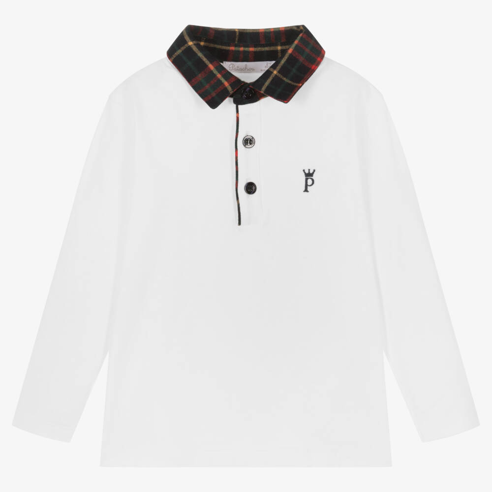 White cotton polo top for boys by classic Portuguese brand Patachou, with a navy blue and red tartan collar and trim. It is made in super soft, brushed jersey with logo button fastenings and an embroidered logo on one side in navy blue. The top has side vents to allow extra movement.