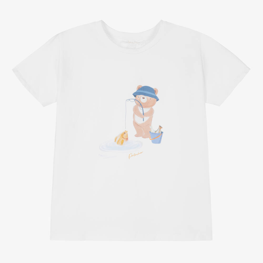 Boys white T-shirt by Patachou, made in soft cotton jersey for comfort. On the front, there is an adorable fishing teddy bear print with the brand's script logo underneath.