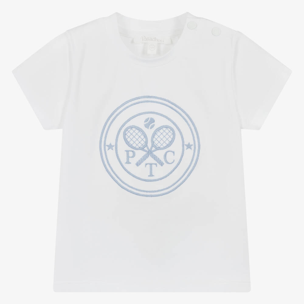 White T-shirt for boys by Patachou, made in soft and stretchy cotton jersey. It has a blue logo embroidered on the front with crossed tennis rackets and a tennis ball for a sports-themed look. Cool and comfortable to wear, with short sleeves, it has branded popper fastenings on one shoulder.