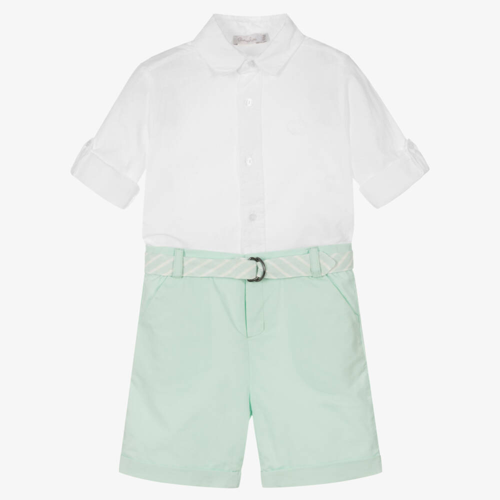 From Portuguese brand Patachou, a white shirt and mint green shorts set for boys. The shirt is made in a lightweight linen and cotton blend with an embroidered logo on the chest and sleeves that can be rolled up and secured with a button tab. The Bermuda shorts are made in comfortable cotton twill. They have an adjustable waist for a great fit and come wi the a striped fabric belt. To complete the look, there are slanted front pockets and a single welt pocket on the back with a decorative button detail.