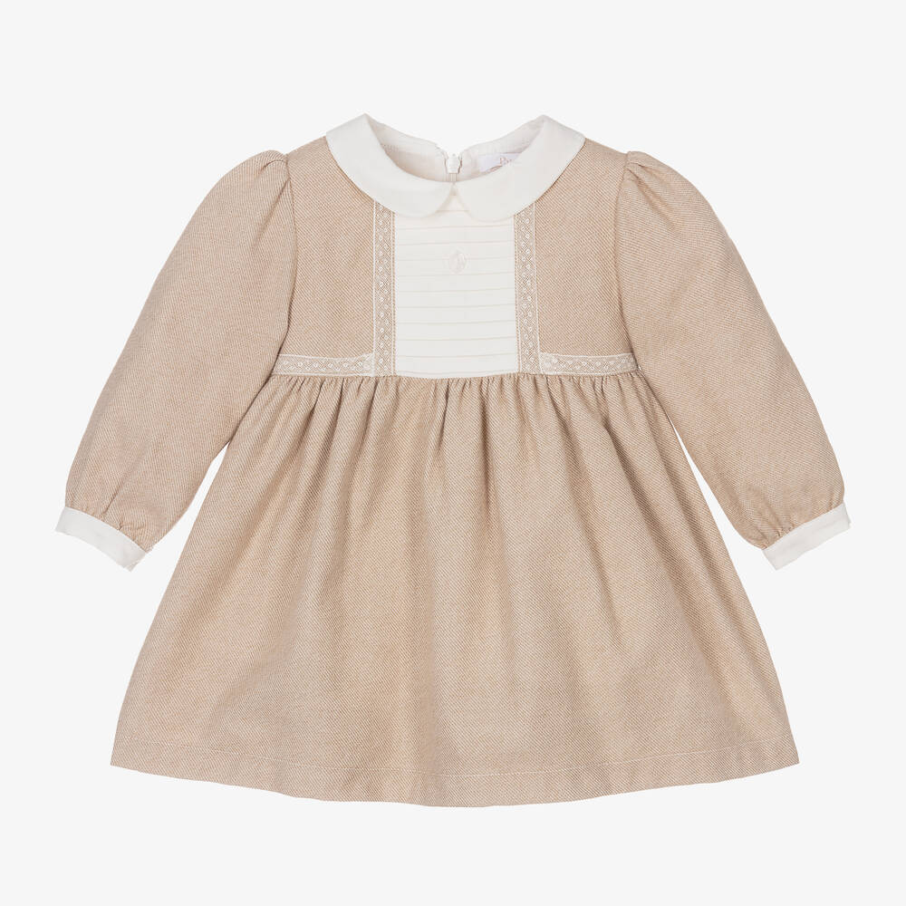 A lovely beige dress for younger girls by Patachou, woven in cotton twill for a beautifully soft feel. This classic silhouette has a rounded Peter Pan collar with ivory pintucks below. Delicate lace trims add detail to the bodice, along with the brand's pearlescent logo charm centred on the front. The long sleeves gently gather on the shoulder and narrow towards the buttoned cuffs. It is fully lined with lightweight voile and fastens on the back with a discreet zip.