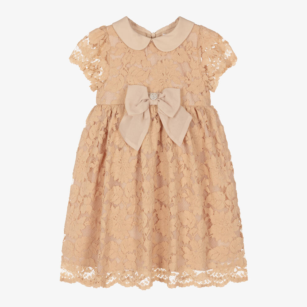 Beautiful beige dress for little girls by classic Portuguese brand Patachou, exclusive to Childrensalon and ideal for a special occasion. Made in lightweight chiffon with a lace overlay, it has a round, chiffon collar and pretty scalloped edges on the cuffs and hemline. There is a fixed chiffon bow on the waist, sparkling with a central diamanté and pearl bead button. The dress has a full, gathered skirt, is lined in voile for comfort and fastens with a discreet, concealed zip on the back.