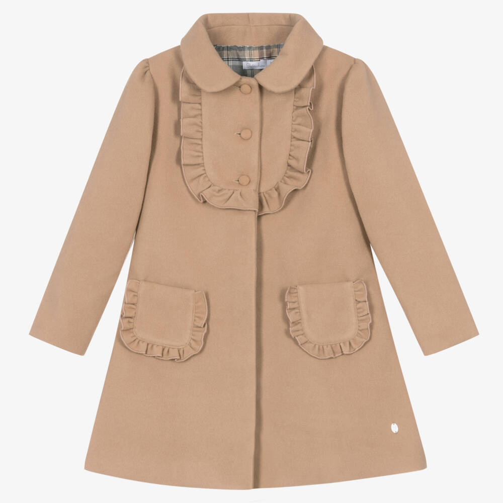 Exclusive to Childrensalon, a traditional beige coat for girls from Patachou, made in a soft felted fabric. This timeless design has a rounded collar, two useful patch pockets on the front and pretty ruffle trims. Lightly padded for warmth, it has a silky lightweight lining for comfort and fastens neatly at the front with buttons.