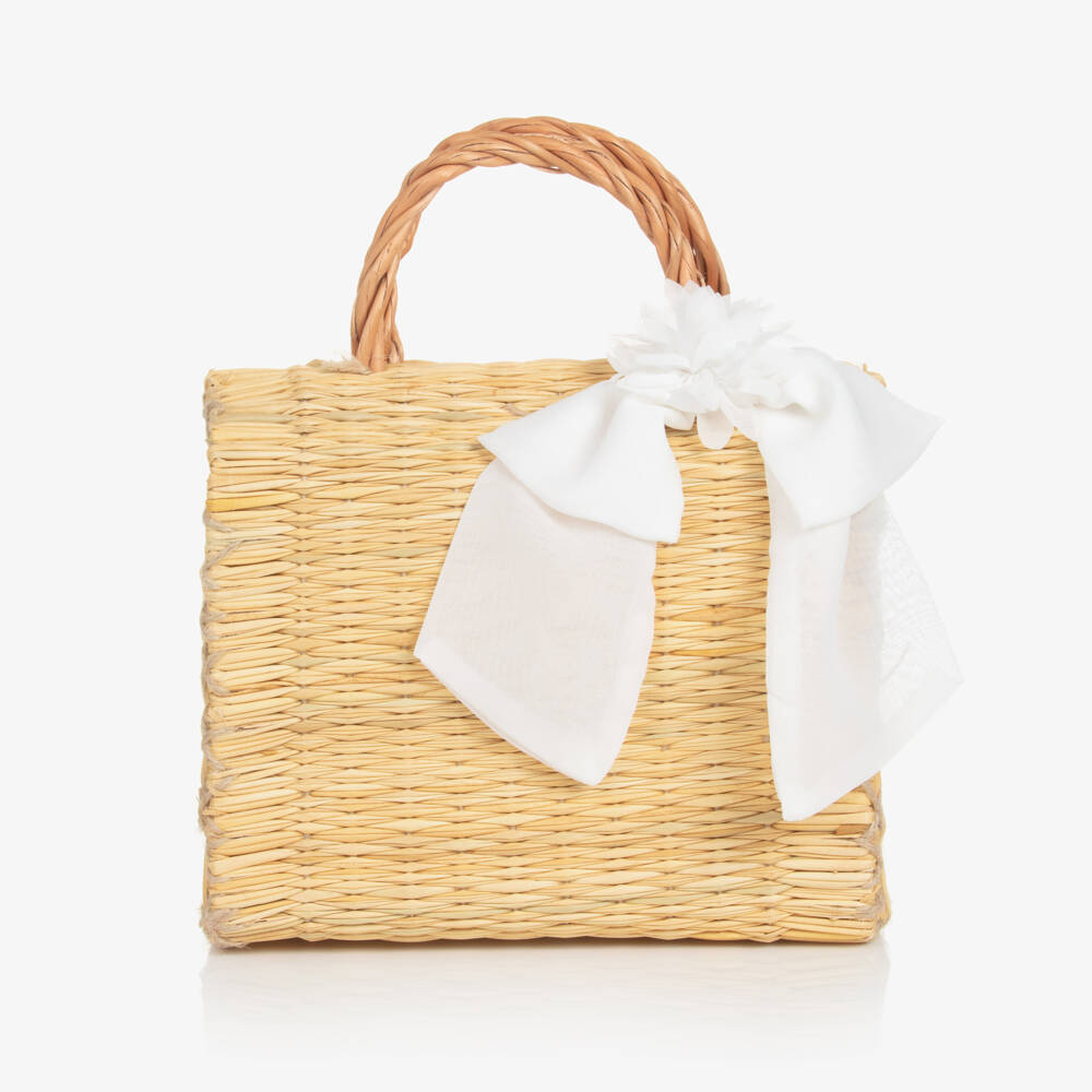Beige straw handbag for girls by Patachou, exclusive to Childrensalon. It has fixed carry handles and a pretty white chiffon bow and flower attached to the front. This open top bag simply closes together by holding the handles.