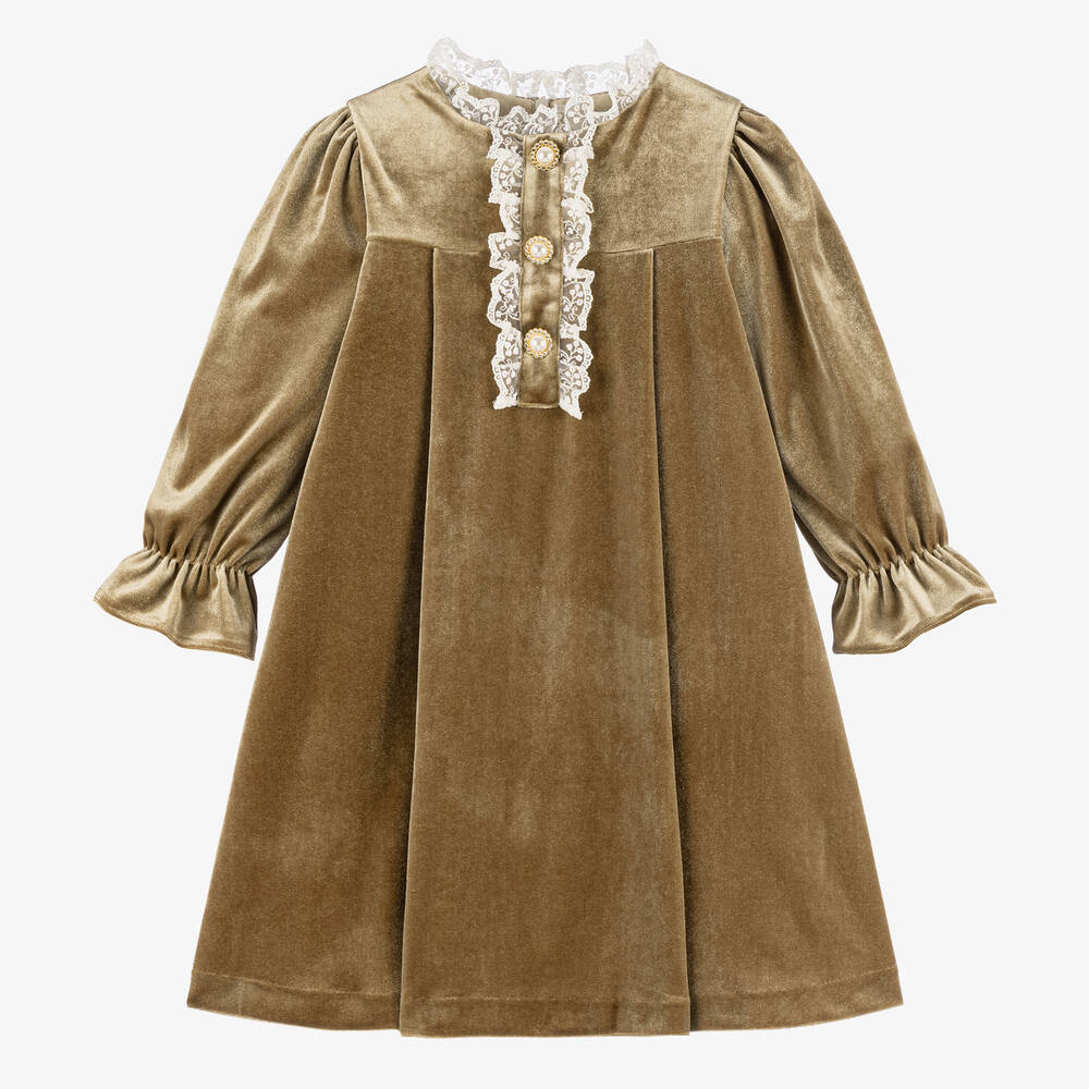 Exclusive to Childrensalon, a lovely golden beige dress for girls by Patachou. Simple but elegant, it is made in soft glittery velour and fully lined for comfort. Gently pleated at the bodice to give the A-line shape a flowing, flared look, it has puffed long sleeves with elasticated cuffs. There is a pretty ivory lace ruffle collar with a matching trim on the front and sparkly diamanté and pearl decorative buttons. It fastens neatly on the back with a concealed zip.