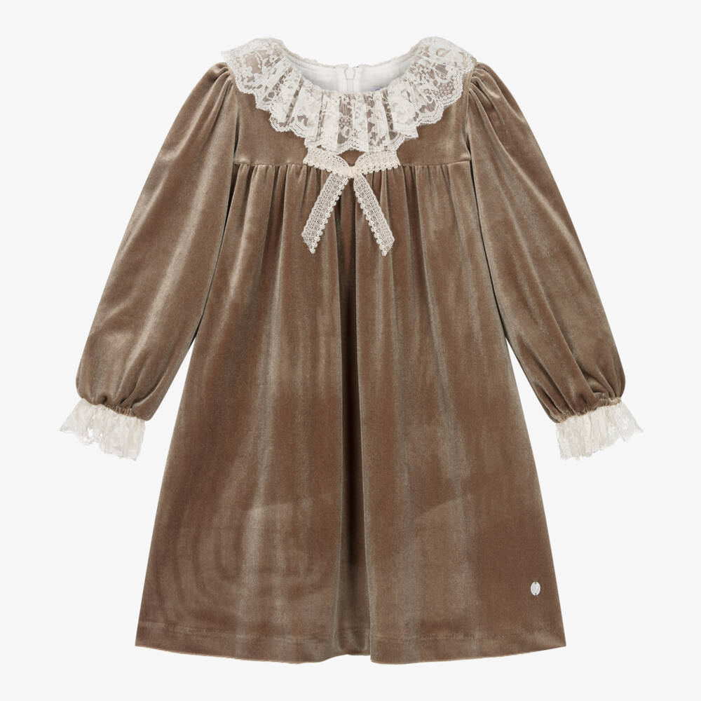 Girls Beige Velour Lace Collar Dress