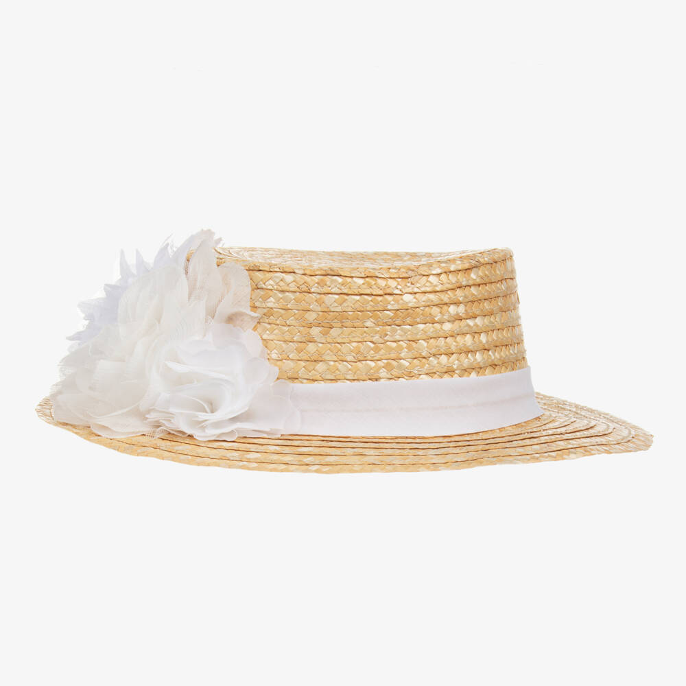 Beige boater-style straw hat for girls by Patachou. It has a wide brim and a white band with a gorgeous chiffon and tulle flower decoration on one side.