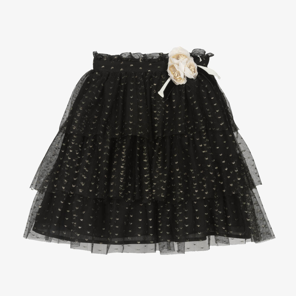 Lovely for a special occasion, this elegant black skirt for girls is by Patachou. Made in sheer chiffon, it has tiers of tulle ruffles with gold glitter detailing for eye-catching sparkle. The front is embellished with a gorgeous ivory fabric flower decoration, trimmed with a black velvet and ivory grosgrain bow. Lined in lightweight cotton for comfort, the skirt fastens discreetly with a concealed zip and button on the side.