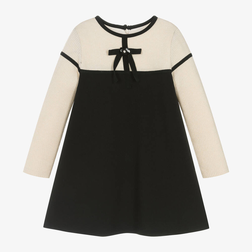 In black and ivory, this long-sleeved dress for girls is by Portuguese brand Patachou. The ribbed knit bodice is woven with glittery silver thread and detailed with grosgrain trims on the upper arm. A 3D sequin flower, with a diamanté centre, adds an extra pretty touch to the black grosgrain bow. The skirt has an A-line shape and is made in stretchy crêpe jersey for a contrast in textures. Together, a button and zip fasten on the back.