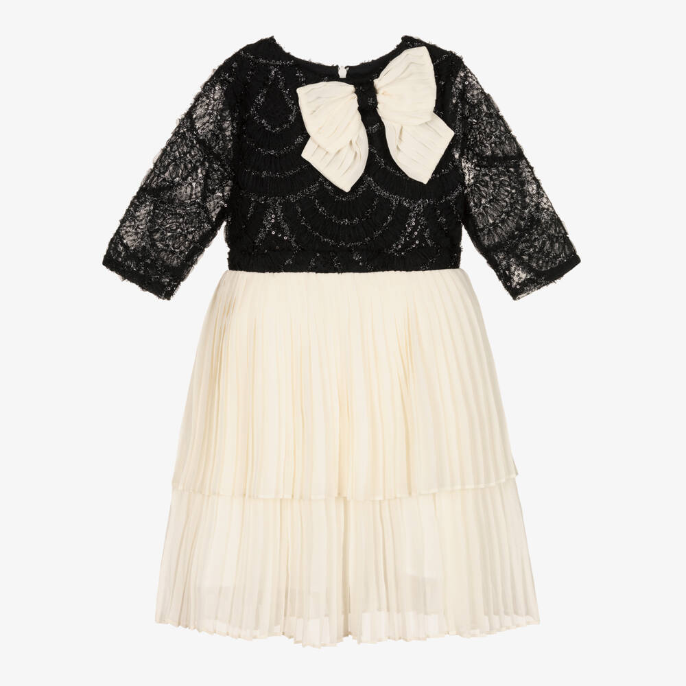 From Portuguese brand Patachou and exclusive to Childrensalon, this stunning black and ivory dress is for girls. The black lace bodice is embellished with tonal sequins and sparkly thread for a touch of glamorous elegance. Ivory chiffon is pleated and tiered to create a free-moving skirt to complete the feminine silhouette and is used for a contrasting bow on the chest. A concealed zip fastening on the back makes dressing fuss-free with a neat finish.