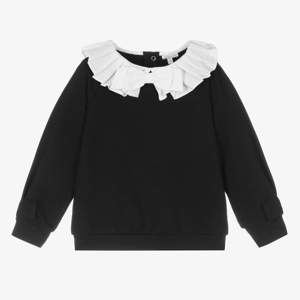 Exclusive to Childrensalon, this charming black sweatshirt for girls by Patachou is made from soft and stretchy Milano jersey. It has a statement white pleated collar with a pretty bow at the neckline for a classic look. The long sleeves have a discreet black bow detailing on each cuff, and there are back popper fastenings for easy dressing.