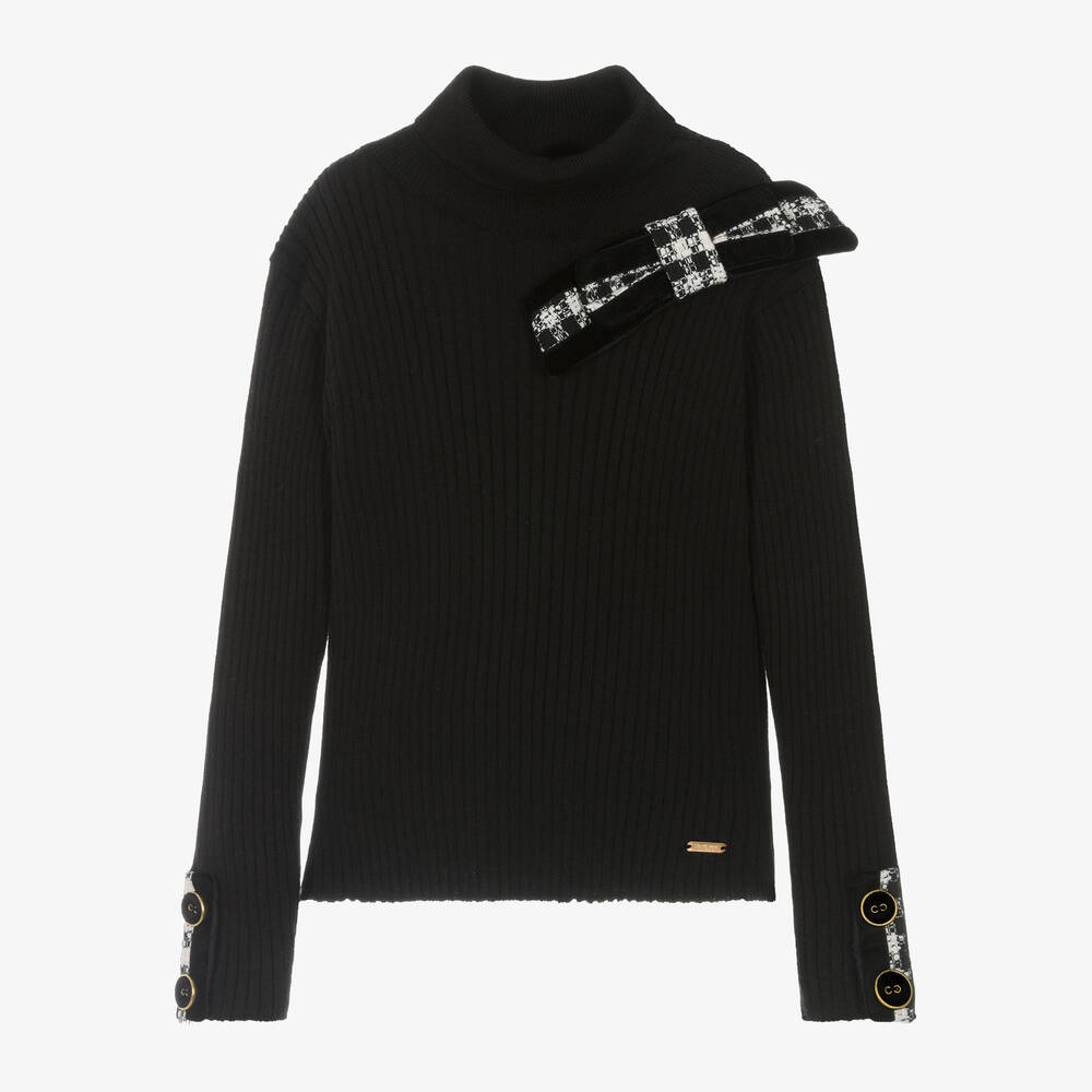 Black roll neck top for girls by Portuguese brand Patachou, made in a beautifully soft, ribbed viscose blend. Exclusive to Childrensalon, this stylish top has an oversized tweed and velvet bow decorating one shoulder, with a matching buttoned trim on each cuff. For a subtle designer finish, a gold-tone logo charm is sewn just above the hem.