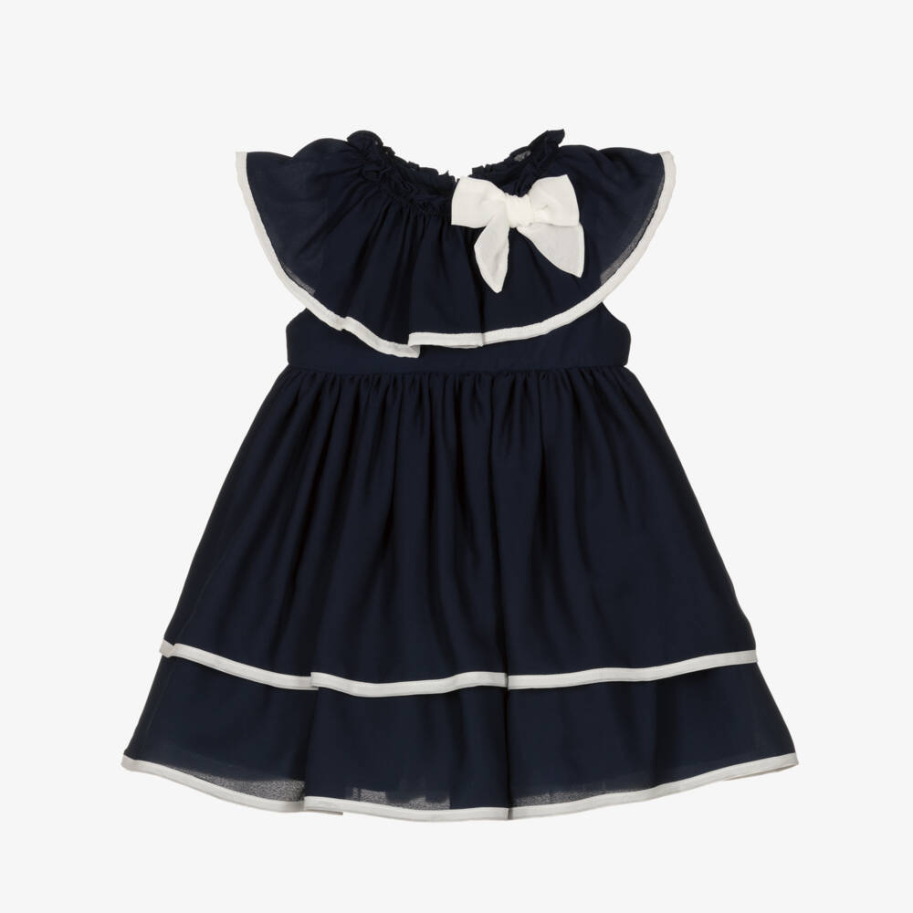 Navy blue dress for girls by Portuguese brand Patachou, made in layers of chiffon. Evoking traditional elegance, it has a ruffled collar with a white bow appliqué and piping trims. Lined in soft and lightweight voile with tulle trim for added volume, there is a concealed zip fastening on the back.