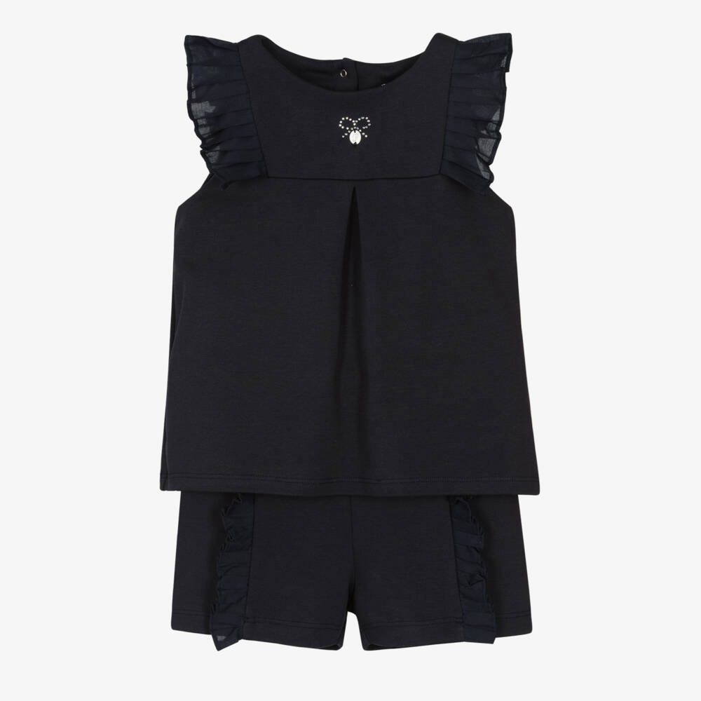 Lovely navy blue cotton shorts set for girls by classic Portuguese brand Patachou, made in soft, comfortable jersey. The top has a sparkling diamanté bow with a pearlescent logo charm on the front, and ruffle-trimmed shoulders. There are popper fastenings on the back. The pretty, coordinating shorts have ruffled front seams and a stretchy elasticated waist for a good fit.